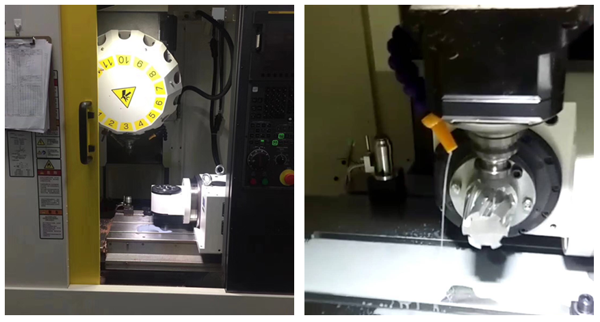 下圖是沃迪士WDS-T100型號單臂四軸在發(fā)那科機(jī)床上五軸聯(lián)動加工航空部件的過程: