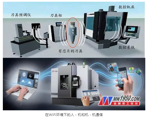 從圖中可見,不僅人機(jī)的交互方式從控制面板延伸到移動(dòng)終端,設(shè)備和工具之間也可以進(jìn)行物與物的通信。機(jī)床的加工精度和效率在很大程度上取決于刀具的狀態(tài),如果在刀具或刀柄上嵌入芯片,就成為智能刀具。芯片不僅可以記錄在刀具預(yù)調(diào)儀上進(jìn)行調(diào)整時(shí)的數(shù)據(jù),還可以記錄刀具在機(jī)床進(jìn)行了多長(zhǎng)的切削時(shí)間,還有多少剩余壽命,可以加工幾個(gè)零件等都可以讓操作者和有關(guān)部門了如指掌,減少停機(jī)和更換刀具的時(shí)間。智能刀具及其管理的概念如上圖所示。