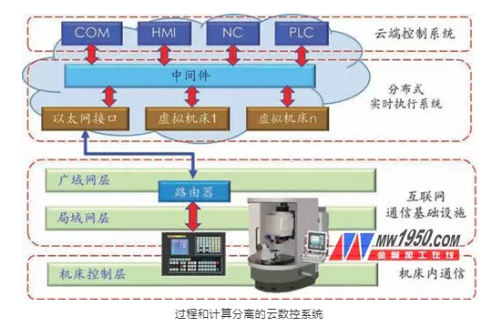 智能工廠的數(shù)控機(jī)床和機(jī)器人等智能裝備的未來(lái)發(fā)展重點(diǎn)已經(jīng)不在硬件,感知外部環(huán)境和工況變化需要更加強(qiáng)大的計(jì)算能力、通信帶寬和速度,才能進(jìn)行實(shí)時(shí)控制,形成真正的信息物理融合系統(tǒng)。它的特點(diǎn)是將設(shè)備的控制分為計(jì)算和過程兩部分,把運(yùn)動(dòng)控制保留在本地,而將計(jì)算移到云端,在云端“克隆”相應(yīng)的虛擬設(shè)備,在云端進(jìn)行虛擬制造,如圖所示。